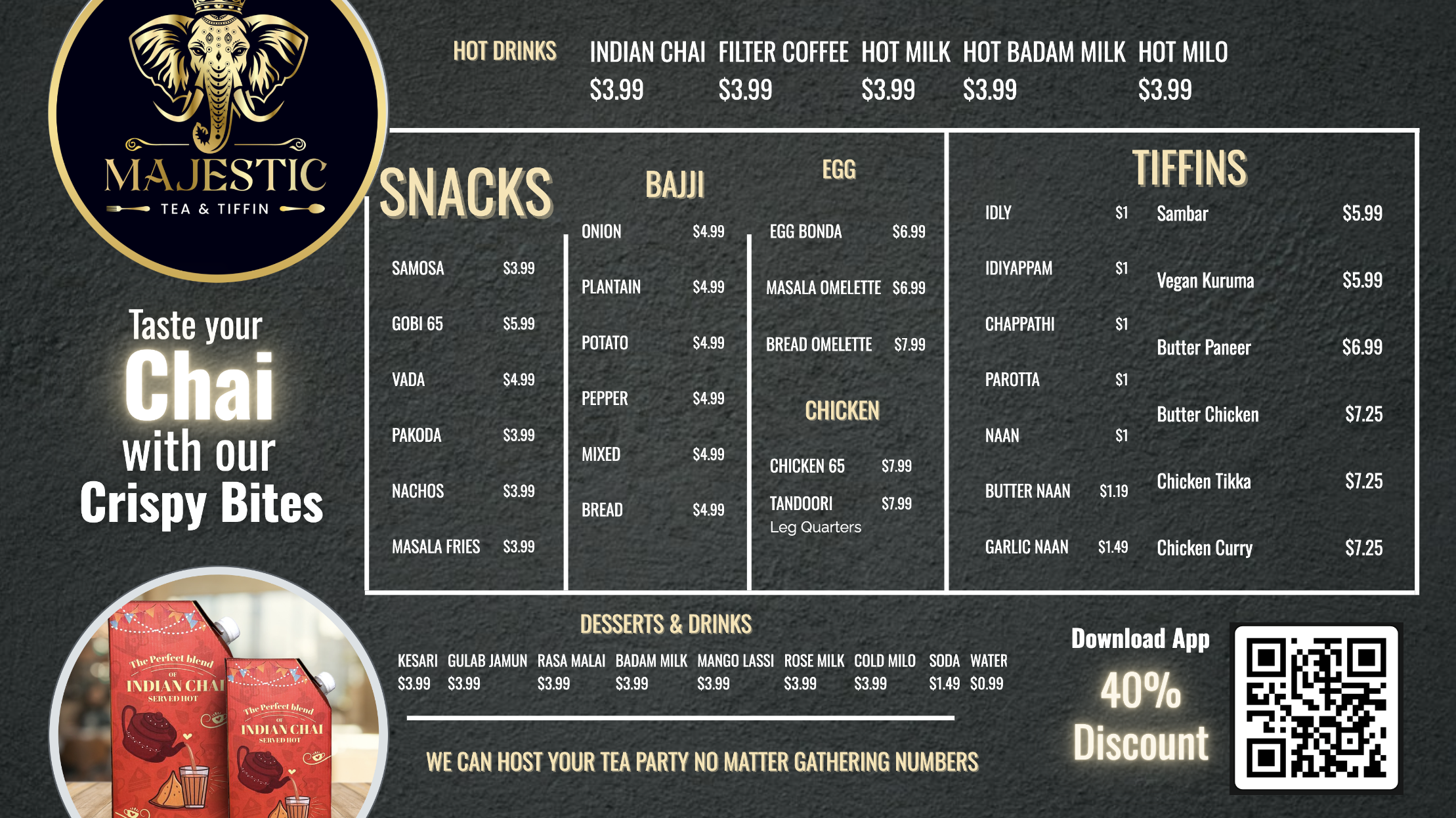 Majestic Tea & Tiffin Order PickUp Order Delivery Location & Hours 20 Washington, Santa Clara, CA 95050 Pickup & DeliveryMon to Sun - 8:00 AM to 7:45 PM